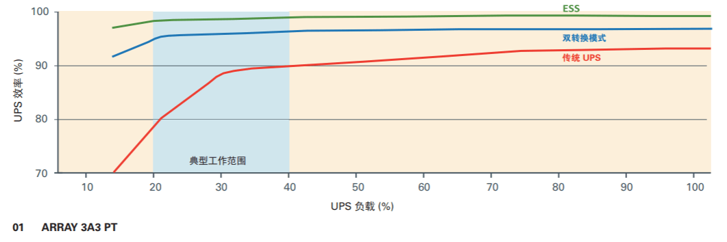 作為一款向高功率密度延伸的產品,ARRAY 3A3PT 60-600kVA UPS以多項創新技術加持,在高效節能上為中大型數據中心應用做好了綠色、低碳準備。在雙變換模式下效率高達 97%;在交流直供 ESS 工作模式下效率高達 99%。
